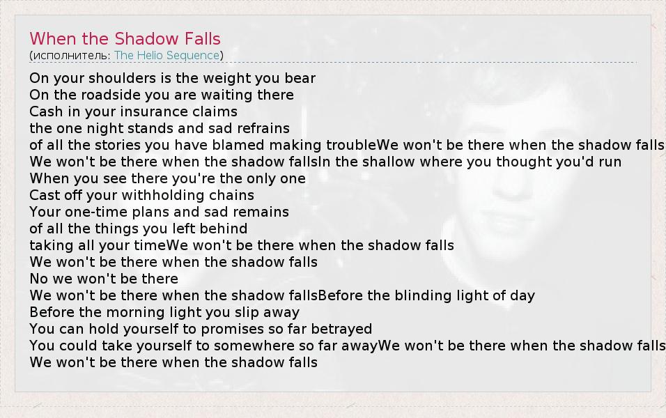 On your shoulders is the weight you bear On the roadside you are waiting there Cash in your insurance claims the one night stands and sad refrains of all the stories you have blamed making troubleWe won't be there when the shadow falls We won't be there when the shadow fallsIn the shallow where you thought you'd run When you see there you're the only one Cast off your withholding chains Your one-time plans and sad remains of all the things you left behind taking all your timeWe won't be there when the shadow falls We won't be there when the shadow falls No we won't be there We won't be there when the shadow fallsBefore the blinding light of day Before the morning light you slip away You can hold yourself to promises so far betrayed You could take yourself to somewhere so far awayWe won't be there when the shadow falls We won't be there when the shadow falls