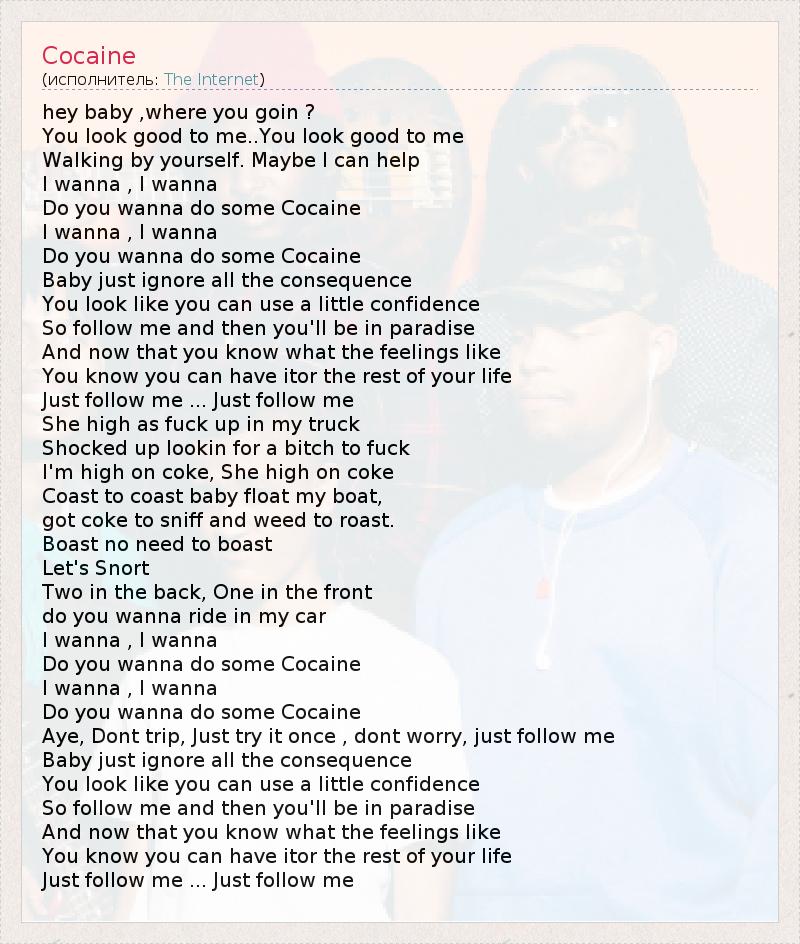 hey baby ,where you goin ? You look good to me..You look good to me Walking by yourself. Maybe I can help I wanna , I wanna Do you wanna do some Cocaine I wanna , I wanna Do you wanna do some Cocaine Baby just ignore all the consequence You look like you can use a little confidence So follow me and then you'll be in paradise And now that you know what the feelings like You know you can have itor the rest of your life Just follow me ... Just follow me She high as fuck up in my truck Shocked up lookin for a bitch to fuck I'm high on coke, She high on coke Coast to coast baby float my boat, got coke to sniff and weed to roast. Boast no need to boast Let's Snort Two in the back, One in the front do you wanna ride in my car I wanna , I wanna Do you wanna do some Cocaine I wanna , I wanna Do you wanna do some Cocaine Aye, Dont trip, Just try it once , dont worry, just follow me Baby just ignore all the consequence You look like you can use a little confidence So follow me and then you'll be in paradise And now that you know what the feelings like You know you can have itor the rest of your life Just follow me ... Just follow me