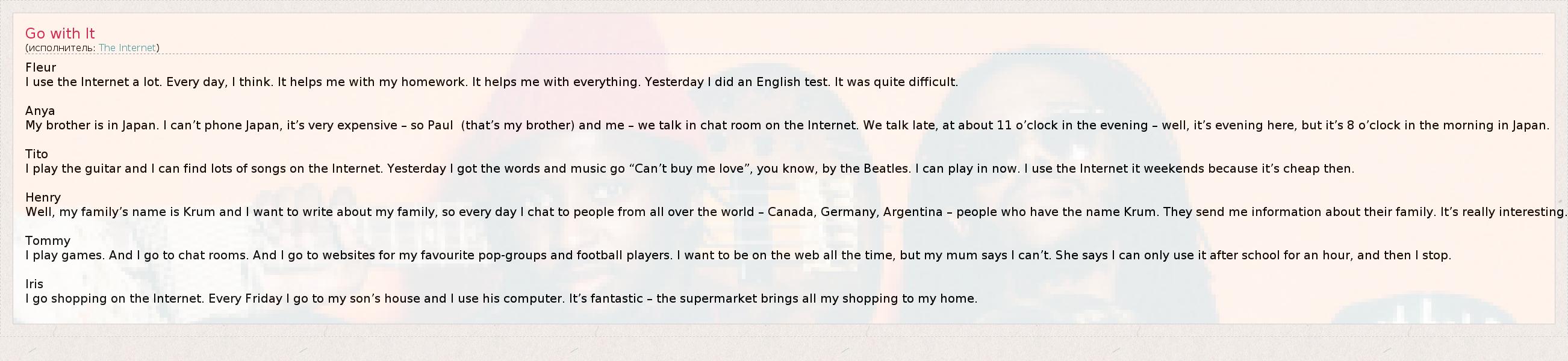 I play the guitar and I can find lots of songs on the Internet. Yesterday I got the words and music go “Can’t buy me love”, you know, by the Beatles. I can play in now. I use the Internet it weekends because it’s cheap then.