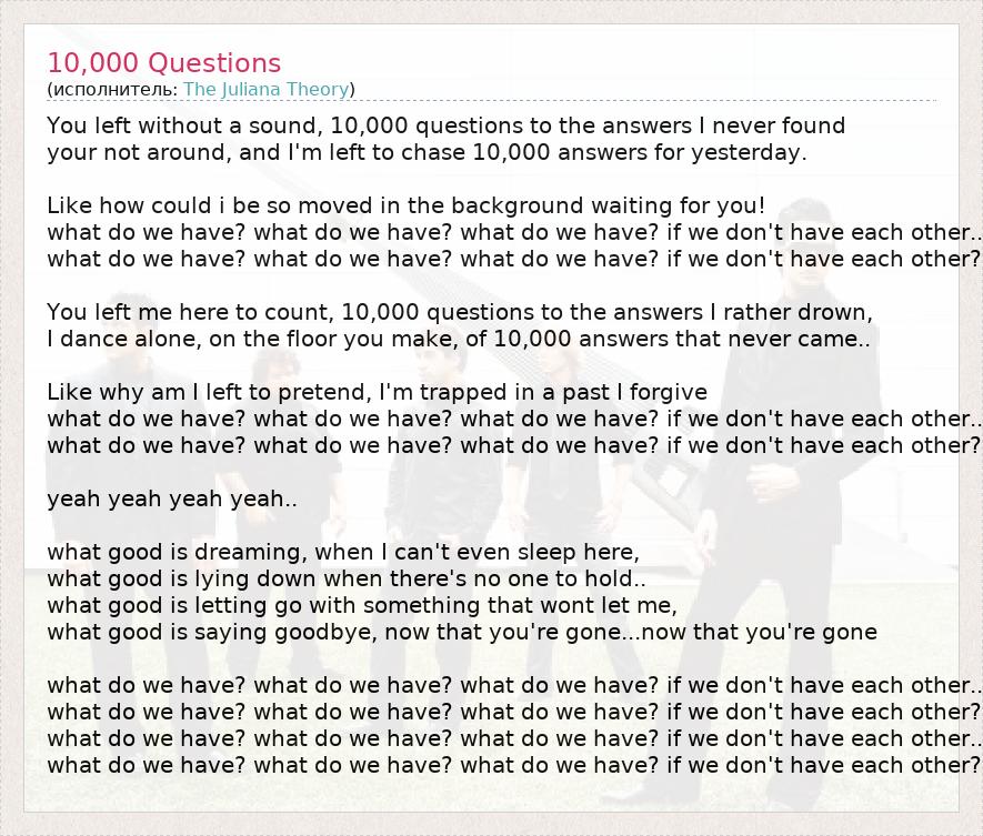 А как ты думаешь, о чем песня "10,000 Questions" ?
