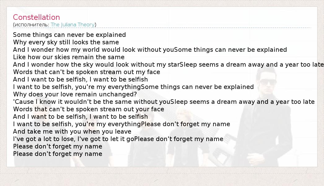 Это интересно:В разработке "Теории Джулианы", а проще говоря - в создании американской команды Juliana Theory, принимали участие пятеро начинающих музыкантов: вокалист и гитарист Бретт Дитар (Brett Detar), басист и бэк-вокалист Чэд Алан (Chad Alan), гитарист Джошуа Фидлер (Joshua Fiedler), гитарист и бэк-вокалист Джошуа Коскер (Joshua Kosker) и барабанщик Нил Хебранк (Neil Hebrank). Объединяла их любовь к классическому року и чутье... продолжение
