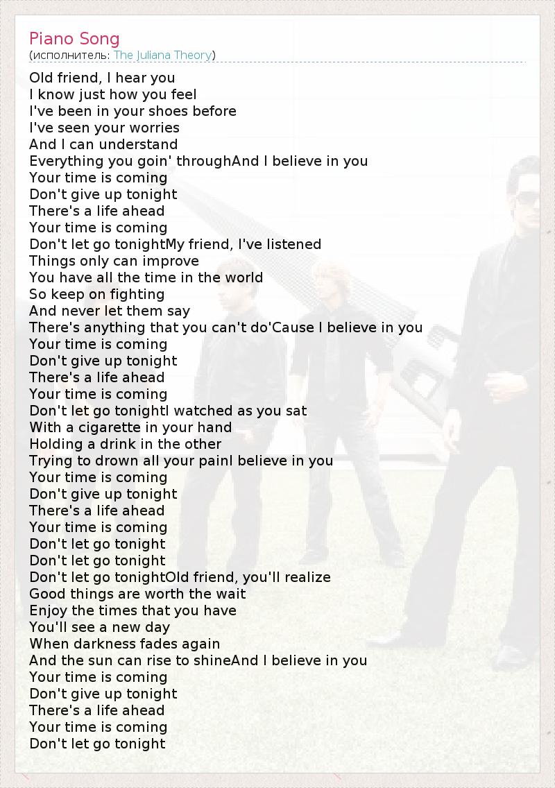Это интересно:В разработке "Теории Джулианы", а проще говоря - в создании американской команды Juliana Theory, принимали участие пятеро начинающих музыкантов: вокалист и гитарист Бретт Дитар (Brett Detar), басист и бэк-вокалист Чэд Алан (Chad Alan), гитарист Джошуа Фидлер (Joshua Fiedler), гитарист и бэк-вокалист Джошуа Коскер (Joshua Kosker) и барабанщик Нил Хебранк (Neil Hebrank). Объединяла их любовь к классическому року и чутье... продолжение