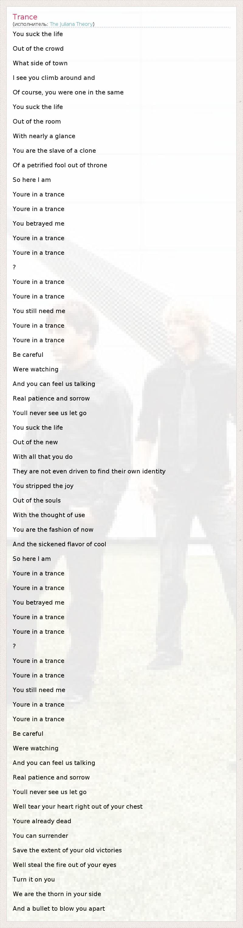 You suck the life Out of the crowd What side of town I see you climb around and Of course, you were one in the same You suck the life Out of the room With nearly a glance You are the slave of a clone Of a petrified fool out of throne So here I am Youre in a trance Youre in a trance You betrayed me Youre in a trance Youre in a trance ? Youre in a trance Youre in a trance You still need me Youre in a trance Youre in a trance Be careful Were watching And you can feel us talking Real patience and sorrow Youll never see us let go You suck the life Out of the new With all that you do They are not even driven to find their own identity You stripped the joy Out of the souls With the thought of use You are the fashion of now And the sickened flavor of cool So here I am Youre in a trance Youre in a trance You betrayed me Youre in a trance Youre in a trance ? Youre in a trance Youre in a trance You still need me Youre in a trance Youre in a trance Be careful Were watching And you can feel us talking Real patience and sorrow Youll never see us let go Well tear your heart right out of your chest Youre already dead You can surrender Save the extent of your old victories Well steal the fire out of your eyes Turn it on you We are the thorn in your side And a bullet to blow you apart