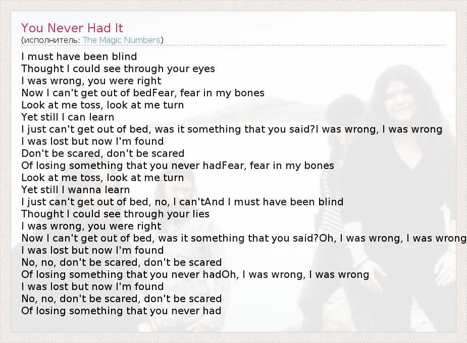 А как ты думаешь, о чем песня "You Never Had It" ?