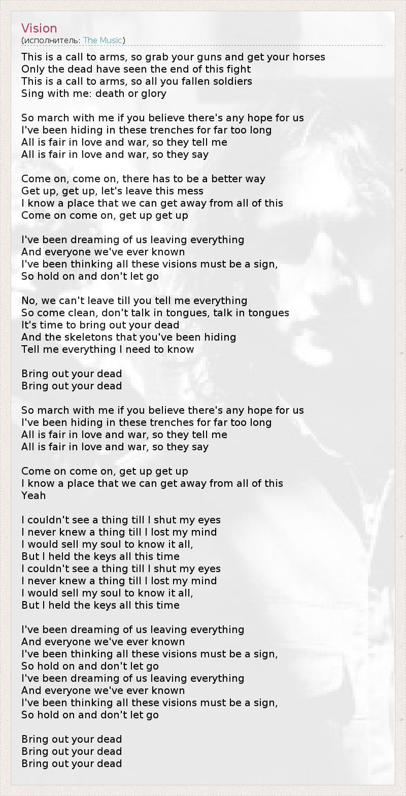 This is a call to arms, so grab your guns and get your horses Only the dead have seen the end of this fight This is a call to arms, so all you fallen soldiers Sing with me: death or glory So march with me if you believe there's any hope for us I've been hiding in these trenches for far too long All is fair in love and war, so they tell me All is fair in love and war, so they say Come on, come on, there has to be a better way Get up, get up, let's leave this mess I know a place that we can get away from all of this Come on come on, get up get up I've been dreaming of us leaving everything And everyone we've ever known I've been thinking all these visions must be a sign, So hold on and don't let go No, we can't leave till you tell me everything So come clean, don't talk in tongues, talk in tongues It's time to bring out your dead And the skeletons that you've been hiding Tell me everything I need to know Bring out your dead Bring out your dead So march with me if you believe there's any hope for us I've been hiding in these trenches for far too long All is fair in love and war, so they tell me All is fair in love and war, so they say Come on come on, get up get up I know a place that we can get away from all of this Yeah I couldn't see a thing till I shut my eyes I never knew a thing till I lost my mind I would sell my soul to know it all, But I held the keys all this time I couldn't see a thing till I shut my eyes I never knew a thing till I lost my mind I would sell my soul to know it all, But I held the keys all this time I've been dreaming of us leaving everything And everyone we've ever known I've been thinking all these visions must be a sign, So hold on and don't let go I've been dreaming of us leaving everything And everyone we've ever known I've been thinking all these visions must be a sign, So hold on and don't let go Bring out your dead Bring out your dead Bring out your dead