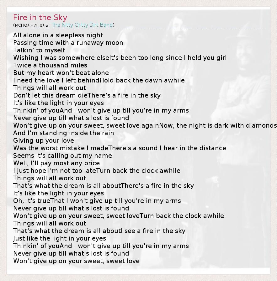 All alone in a sleepless night Passing time with a runaway moon Talkin' to myself Wishing I was somewhere elseIt's been too long since I held you girl Twice a thousand miles But my heart won't beat alone I need the love I left behindHold back the dawn awhile Things will all work out Don't let this dream dieThere's a fire in the sky It's like the light in your eyes Thinkin' of youAnd I won't give up till you're in my arms Never give up till what's lost is found Won't give up on your sweet, sweet love againNow, the night is dark with diamonds And I'm standing inside the rain Giving up your love Was the worst mistake I madeThere's a sound I hear in the distance Seems it's calling out my name Well, I'll pay most any price I just hope I'm not too lateTurn back the clock awhile Things will all work out That's what the dream is all aboutThere's a fire in the sky It's like the light in your eyes Oh, it's trueThat I won't give up till you're in my arms Never give up till what's lost is found Won't give up on your sweet, sweet loveTurn back the clock awhile Things will all work out That's what the dream is all aboutI see a fire in the sky Just like the light in your eyes Thinkin' of youAnd I won't give up till you're in my arms Never give up till what's lost is found Won't give up on your sweet, sweet love