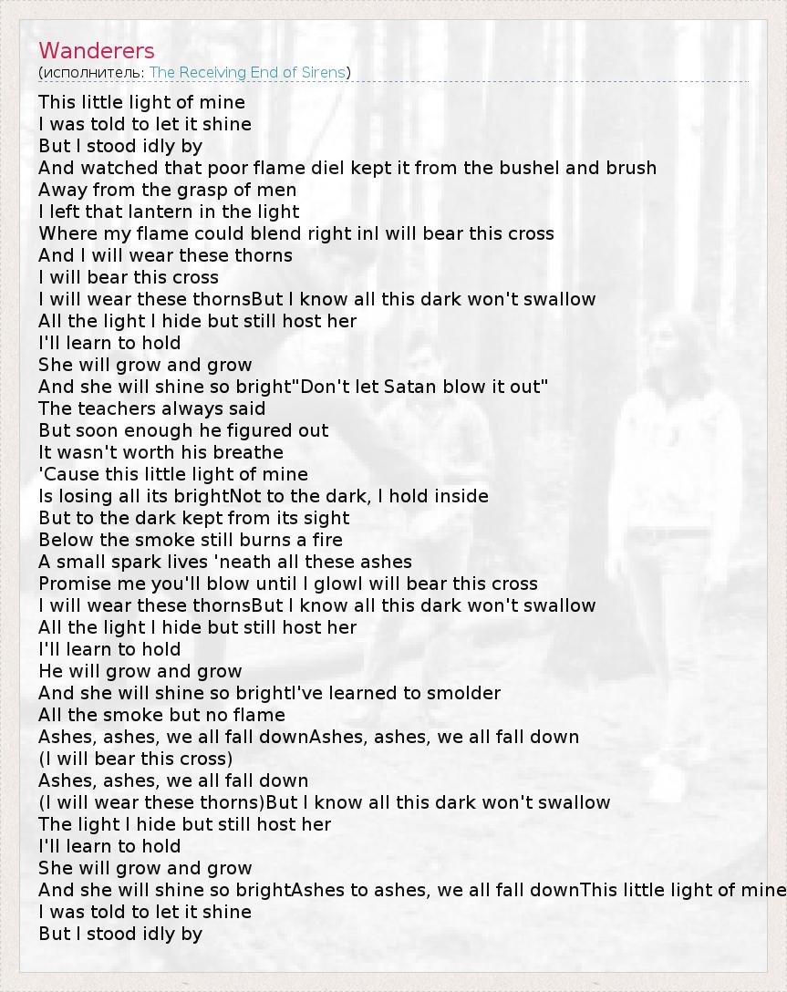 And she will shine so brightAshes to ashes, we all fall downThis little light of mine