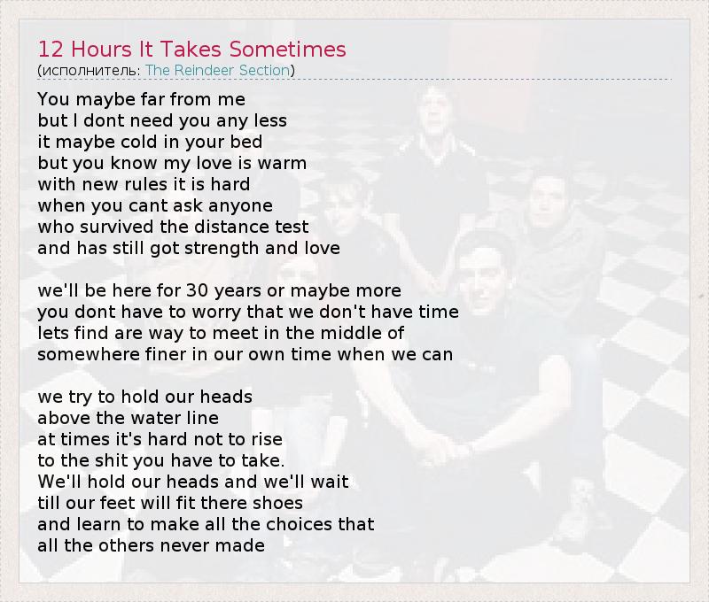 А как ты думаешь, о чем песня "12 Hours It Takes Sometimes" ?