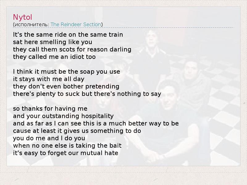 Этоже ездить на том же поезде сел здесь пахнет, как вам Они называют их шотландцы для разума дорогой они называли меня идиотом тоже Я думаю, что это должно бытьмыло вы используете он остается со мной весь день они даже не потрудились делать вид, есть много, чтобы сосать , но нет ничего, чтобы сказать, так что спасибо за то, что меня и непогашенный гостеприимство и, насколько я могу видеть, что этогораздо лучше , чтобы быть причиной по крайней мере, дает нам что-то делать Вы меня и я тебя когда никто не берет приманку это легко забыть, нашу взаимную ненависть
