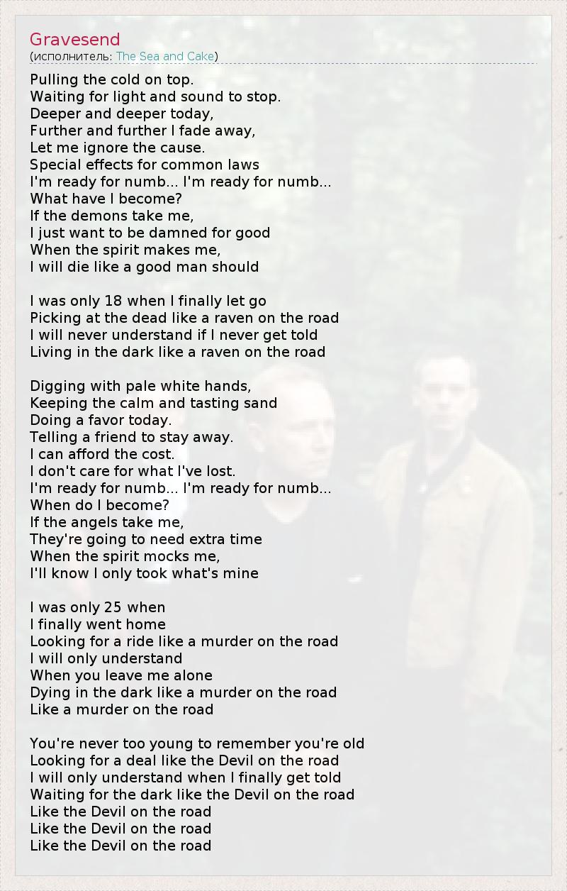 1 – Название песни образовано сложением двух слов – grave (могила) и send (посылать) и никакого отношения к городу Грейвсенд в Англии не имеет. В одном из интервью Кори Тейлор заявил, что главный герой песни приходит на это кладбище с множеством вопросов, которые терзают его, и,  фактически, это переломный момент в его жизни.