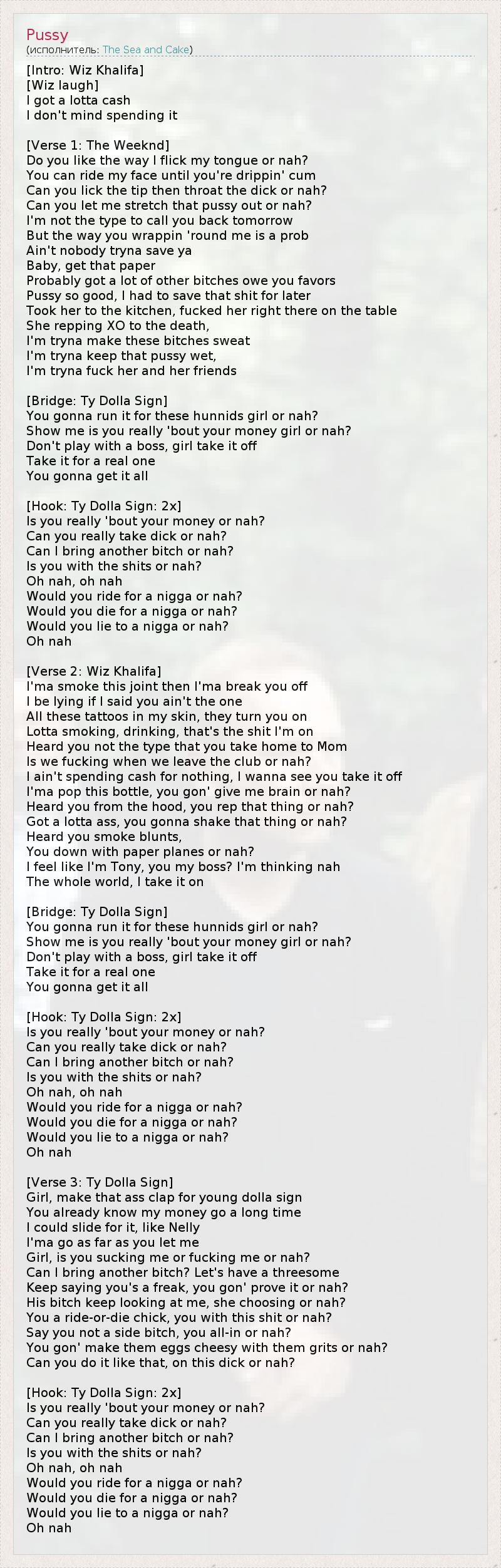 [Intro: Wiz Khalifa] [Wiz laugh] I got a lotta cash I don't mind spending it [Verse 1: The Weeknd] Do you like the way I flick my tongue or nah? You can ride my face until you're drippin' cum Can you lick the tip then throat the dick or nah? Can you let me stretch that pussy out or nah? I'm not the type to call you back tomorrow But the way you wrappin 'round me is a prob Ain't nobody tryna save ya Baby, get that paper Probably got a lot of other bitches owe you favors Pussy so good, I had to save that shit for later Took her to the kitchen, fucked her right there on the table She repping XO to the death, I'm tryna make these bitches sweat I'm tryna keep that pussy wet, I'm tryna fuck her and her friends [Bridge: Ty Dolla Sign] You gonna run it for these hunnids girl or nah? Show me is you really 'bout your money girl or nah? Don't play with a boss, girl take it off Take it for a real one You gonna get it all [Hook: Ty Dolla Sign: 2x] Is you really 'bout your money or nah? Can you really take dick or nah? Can I bring another bitch or nah? Is you with the shits or nah? Oh nah, oh nah Would you ride for a nigga or nah? Would you die for a nigga or nah? Would you lie to a nigga or nah? Oh nah [Verse 2: Wiz Khalifa] I'ma smoke this joint then I'ma break you off I be lying if I said you ain't the one All these tattoos in my skin, they turn you on Lotta smoking, drinking, that's the shit I'm on Heard you not the type that you take home to Mom Is we fucking when we leave the club or nah? I ain't spending cash for nothing, I wanna see you take it off I'ma pop this bottle, you gon' give me brain or nah? Heard you from the hood, you rep that thing or nah? Got a lotta ass, you gonna shake that thing or nah? Heard you smoke blunts, You down with paper planes or nah? I feel like I'm Tony, you my boss? I'm thinking nah The whole world, I take it on [Bridge: Ty Dolla Sign] You gonna run it for these hunnids girl or nah? Show me is you really 'bout your money girl or nah? Don't play with a boss, girl take it off Take it for a real one You gonna get it all [Hook: Ty Dolla Sign: 2x] Is you really 'bout your money or nah? Can you really take dick or nah? Can I bring another bitch or nah? Is you with the shits or nah? Oh nah, oh nah Would you ride for a nigga or nah? Would you die for a nigga or nah? Would you lie to a nigga or nah? Oh nah [Verse 3: Ty Dolla Sign] Girl, make that ass clap for young dolla sign You already know my money go a long time I could slide for it, like Nelly I'ma go as far as you let me Girl, is you sucking me or fucking me or nah? Can I bring another bitch? Let's have a threesome Keep saying you's a freak, you gon' prove it or nah? His bitch keep looking at me, she choosing or nah? You a ride-or-die chick, you with this shit or nah? Say you not a side bitch, you all-in or nah? You gon' make them eggs cheesy with them grits or nah? Can you do it like that, on this dick or nah? [Hook: Ty Dolla Sign: 2x] Is you really 'bout your money or nah? Can you really take dick or nah? Can I bring another bitch or nah? Is you with the shits or nah? Oh nah, oh nah Would you ride for a nigga or nah? Would you die for a nigga or nah? Would you lie to a nigga or nah? Oh nah