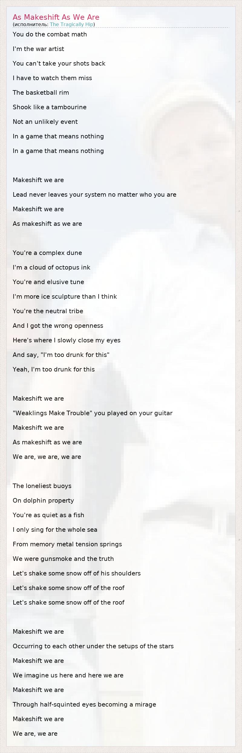You do the combat math I'm the war artist You can't take your shots back I have to watch them miss The basketball rim Shook like a tambourine Not an unlikely event In a game that means nothing In a game that means nothing Makeshift we are Lead never leaves your system no matter who you are Makeshift we are As makeshift as we are You're a complex dune I'm a cloud of octopus ink You're and elusive tune I'm more ice sculpture than I think You're the neutral tribe And I got the wrong openness Here's where I slowly close my eyes And say, "I'm too drunk for this" Yeah, I'm too drunk for this Makeshift we are "Weaklings Make Trouble" you played on your guitar Makeshift we are As makeshift as we are We are, we are, we are The loneliest buoys On dolphin property You're as quiet as a fish I only sing for the whole sea From memory metal tension springs We were gunsmoke and the truth Let's shake some snow off of his shoulders Let's shake some snow off of the roof Let's shake some snow off of the roof Makeshift we are Occurring to each other under the setups of the stars Makeshift we are We imagine us here and here we are Makeshift we are Through half-squinted eyes becoming a mirage Makeshift we are We are, we are