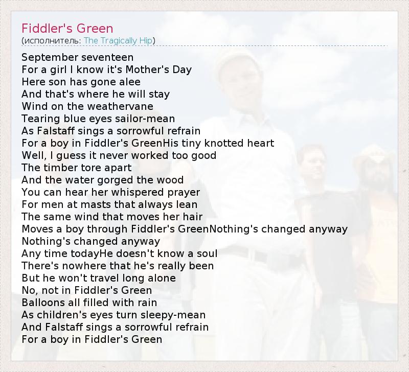September seventeen For a girl I know it's Mother's Day Here son has gone alee And that's where he will stay Wind on the weathervane Tearing blue eyes sailor-mean As Falstaff sings a sorrowful refrain For a boy in Fiddler's GreenHis tiny knotted heart Well, I guess it never worked too good The timber tore apart And the water gorged the wood You can hear her whispered prayer For men at masts that always lean The same wind that moves her hair Moves a boy through Fiddler's GreenNothing's changed anyway Nothing's changed anyway Any time todayHe doesn't know a soul There's nowhere that he's really been But he won't travel long alone No, not in Fiddler's Green Balloons all filled with rain As children's eyes turn sleepy-mean And Falstaff sings a sorrowful refrain For a boy in Fiddler's Green