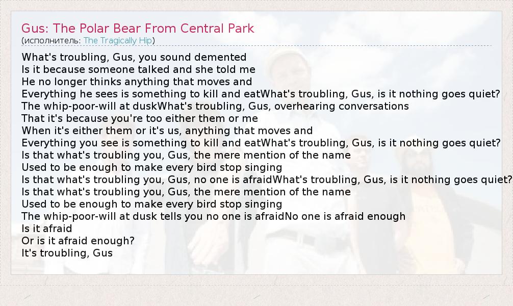 А как ты думаешь, о чем песня "Gus: The Polar Bear From Central Park" ?
