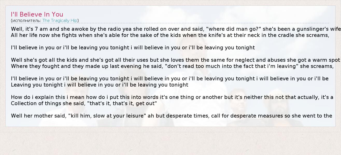 I'll believe in you or i'll be leaving you tonight i will believe in you or i'll be leaving you tonight i will believe in you or i'll be