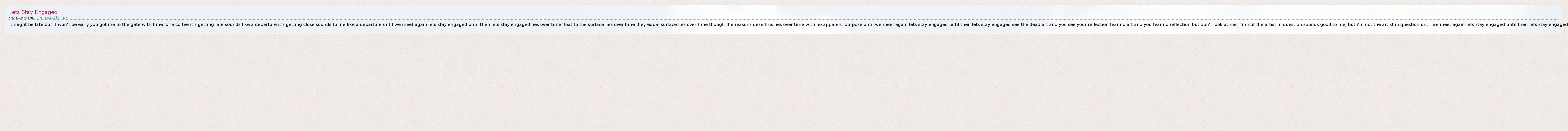 it might be late but it won't be early you got me to the gate with time for a coffee it's getting late sounds like a departure it's getting close sounds to me like a departure until we meet again lets stay engaged until then lets stay engaged lies over time float to the surface lies over time they equal surface lies over time though the reasons desert us lies over time with no apparent purpose until we meet again lets stay engaged until then lets stay engaged see the dead art and you see your reflection fear no art and you fear no reflection but don't look at me, i'm not the artist in question sounds good to me, but i'm not the artist in question until we meet again lets stay engaged until then lets stay engaged
