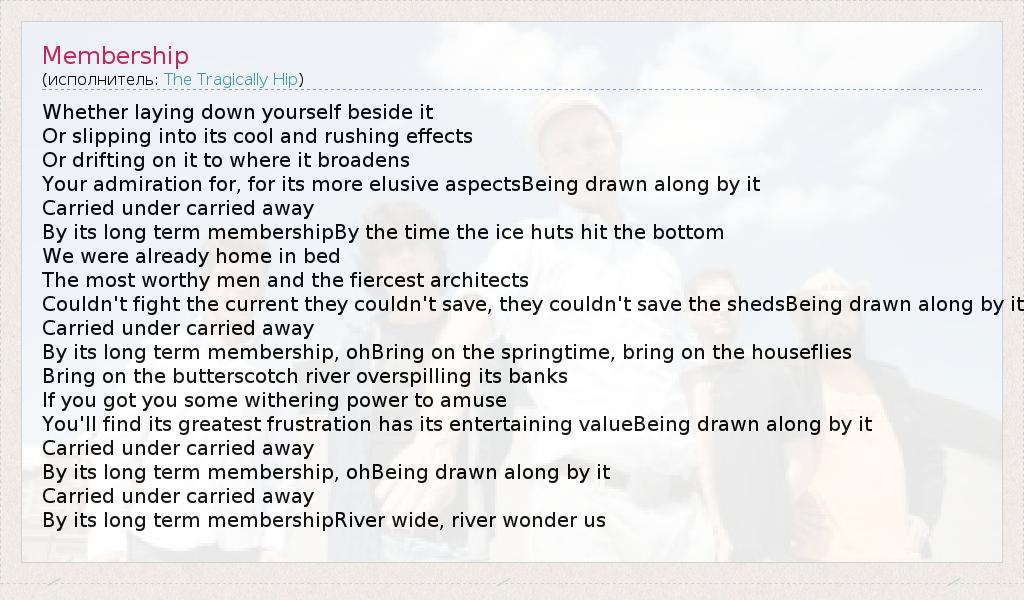 Это интересно:The Tragically Hip (часто просто The Hip) — канадская рок-группа, выступающая с 1983 года. За время существования The Tragically Hip выпустили 12 студийных и два концертных альбома и 46 синглов. Девять альбомов группы возглавляли канадские хит-парады, среди ее многочисленных наград 12 премий «Джуно» и Премия генерал-губернатора за карьерные достижения в области искусства.Группа сформировалась в 1983 году... продолжение