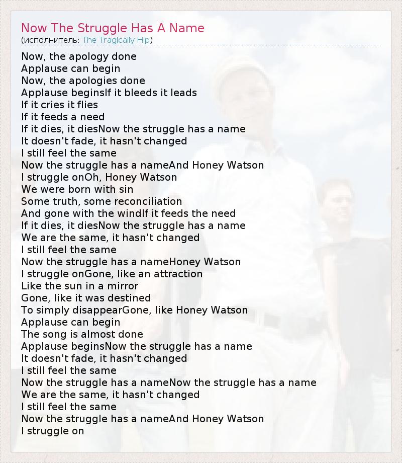 Now, the apology done Applause can begin Now, the apologies done Applause beginsIf it bleeds it leads If it cries it flies If it feeds a need If it dies, it diesNow the struggle has a name It doesn't fade, it hasn't changed I still feel the same Now the struggle has a nameAnd Honey Watson I struggle onOh, Honey Watson We were born with sin Some truth, some reconciliation And gone with the windIf it feeds the need If it dies, it diesNow the struggle has a name We are the same, it hasn't changed I still feel the same Now the struggle has a nameHoney Watson I struggle onGone, like an attraction Like the sun in a mirror Gone, like it was destined To simply disappearGone, like Honey Watson Applause can begin The song is almost done Applause beginsNow the struggle has a name It doesn't fade, it hasn't changed I still feel the same Now the struggle has a nameNow the struggle has a name We are the same, it hasn't changed I still feel the same Now the struggle has a nameAnd Honey Watson I struggle on