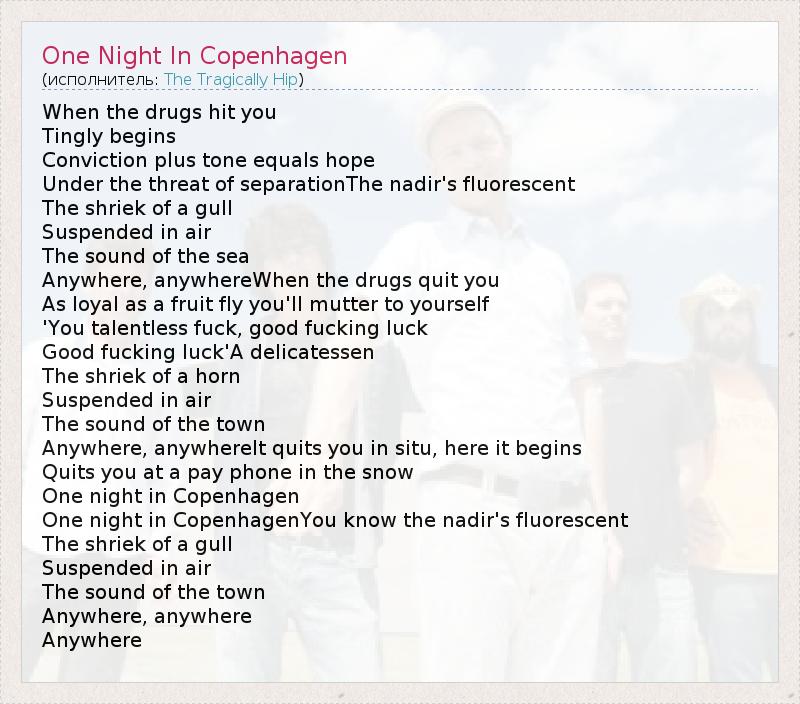 When the drugs hit you Tingly begins Conviction plus tone equals hope Under the threat of separationThe nadir's fluorescent The shriek of a gull Suspended in air The sound of the sea Anywhere, anywhereWhen the drugs quit you As loyal as a fruit fly you'll mutter to yourself 'You talentless fuck, good fucking luck Good fucking luck'A delicatessen The shriek of a horn Suspended in air The sound of the town Anywhere, anywhereIt quits you in situ, here it begins Quits you at a pay phone in the snow One night in Copenhagen One night in CopenhagenYou know the nadir's fluorescent The shriek of a gull Suspended in air The sound of the town Anywhere, anywhere Anywhere