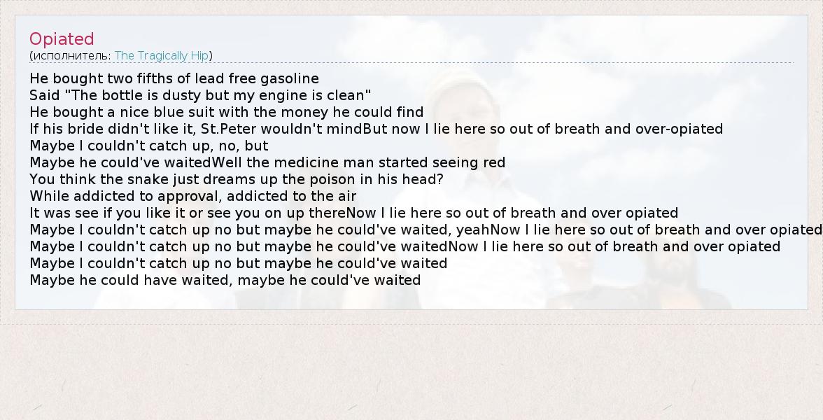He bought two fifths of lead free gasoline Said "The bottle is dusty but my engine is clean" He bought a nice blue suit with the money he could find If his bride didn't like it, St.Peter wouldn't mindBut now I lie here so out of breath and over-opiated Maybe I couldn't catch up, no, but Maybe he could've waitedWell the medicine man started seeing red You think the snake just dreams up the poison in his head? While addicted to approval, addicted to the air It was see if you like it or see you on up thereNow I lie here so out of breath and over opiated Maybe I couldn't catch up no but maybe he could've waited, yeahNow I lie here so out of breath and over opiated Maybe I couldn't catch up no but maybe he could've waitedNow I lie here so out of breath and over opiated Maybe I couldn't catch up no but maybe he could've waited Maybe he could have waited, maybe he could've waited