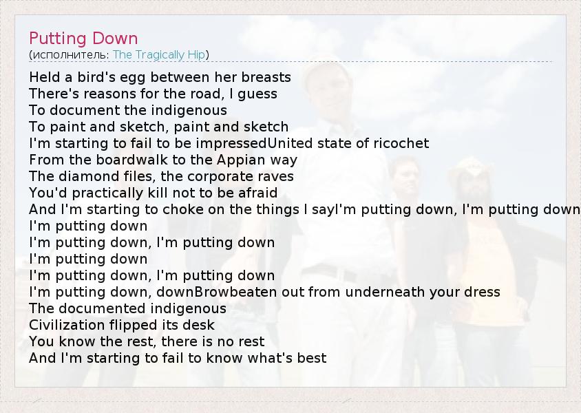 Это интересно:The Tragically Hip (часто просто The Hip) — канадская рок-группа, выступающая с 1983 года. За время существования The Tragically Hip выпустили 12 студийных и два концертных альбома и 46 синглов. Девять альбомов группы возглавляли канадские хит-парады, среди ее многочисленных наград 12 премий «Джуно» и Премия генерал-губернатора за карьерные достижения в области искусства.Группа сформировалась в 1983 году... продолжение