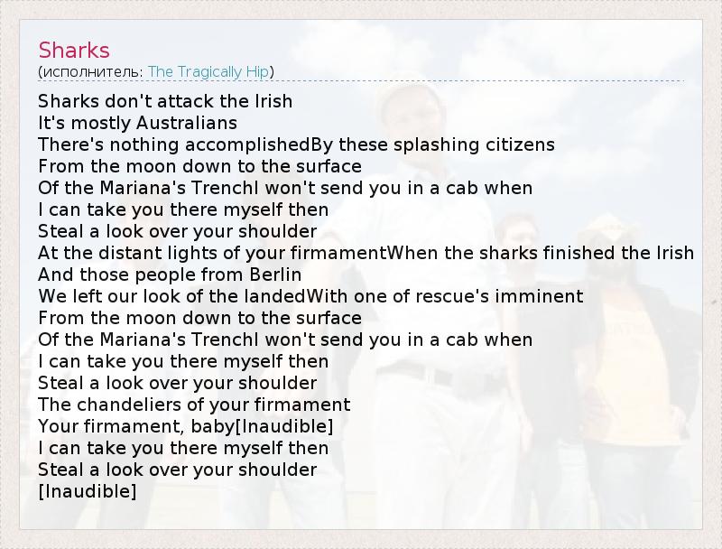 Sharks don't attack the Irish It's mostly Australians There's nothing accomplishedBy these splashing citizens From the moon down to the surface Of the Mariana's TrenchI won't send you in a cab when I can take you there myself then Steal a look over your shoulder At the distant lights of your firmamentWhen the sharks finished the Irish And those people from Berlin We left our look of the landedWith one of rescue's imminent From the moon down to the surface Of the Mariana's TrenchI won't send you in a cab when I can take you there myself then Steal a look over your shoulder The chandeliers of your firmament Your firmament, baby[Inaudible] I can take you there myself then Steal a look over your shoulder [Inaudible]