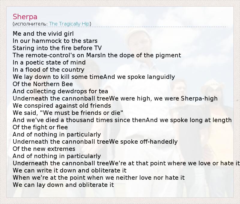 Это интересно:The Tragically Hip (часто просто The Hip) — канадская рок-группа, выступающая с 1983 года. За время существования The Tragically Hip выпустили 12 студийных и два концертных альбома и 46 синглов. Девять альбомов группы возглавляли канадские хит-парады, среди ее многочисленных наград 12 премий «Джуно» и Премия генерал-губернатора за карьерные достижения в области искусства.Группа сформировалась в 1983 году... продолжение