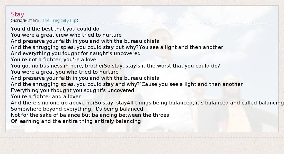 Это интересно:The Tragically Hip (часто просто The Hip) — канадская рок-группа, выступающая с 1983 года. За время существования The Tragically Hip выпустили 12 студийных и два концертных альбома и 46 синглов. Девять альбомов группы возглавляли канадские хит-парады, среди ее многочисленных наград 12 премий «Джуно» и Премия генерал-губернатора за карьерные достижения в области искусства.Группа сформировалась в 1983 году... продолжение