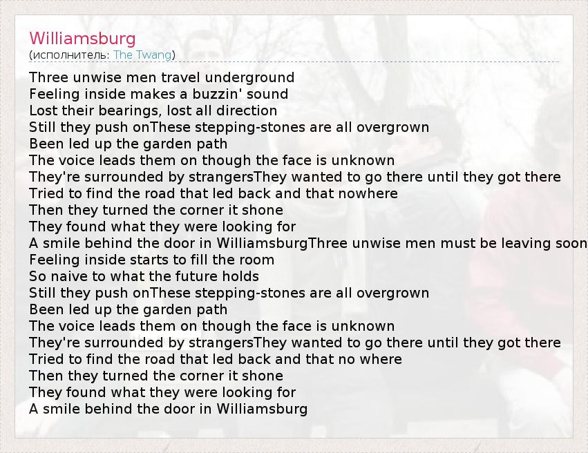А как ты думаешь, о чем песня "Williamsburg" ?