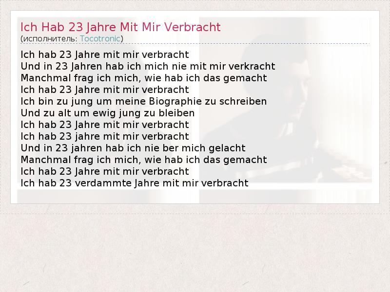 А как ты думаешь, о чем песня "Ich Hab 23 Jahre Mit Mir Verbracht" ?