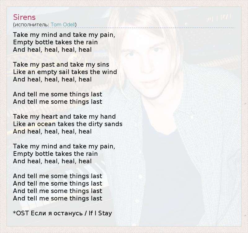 Take my mind and take my pain, Empty bottle takes the rain And heal, heal, heal, heal Take my past and take my sins Like an empty sail takes the wind And heal, heal, heal, heal And tell me some things last And tell me some things last Take my heart and take my hand Like an ocean takes the dirty sands And heal, heal, heal, heal Take my mind and take my pain, Empty bottle takes the rain And heal, heal, heal, heal And tell me some things last And tell me some things last And tell me some things last And tell me some things last *OST Если я останусь / If I Stay