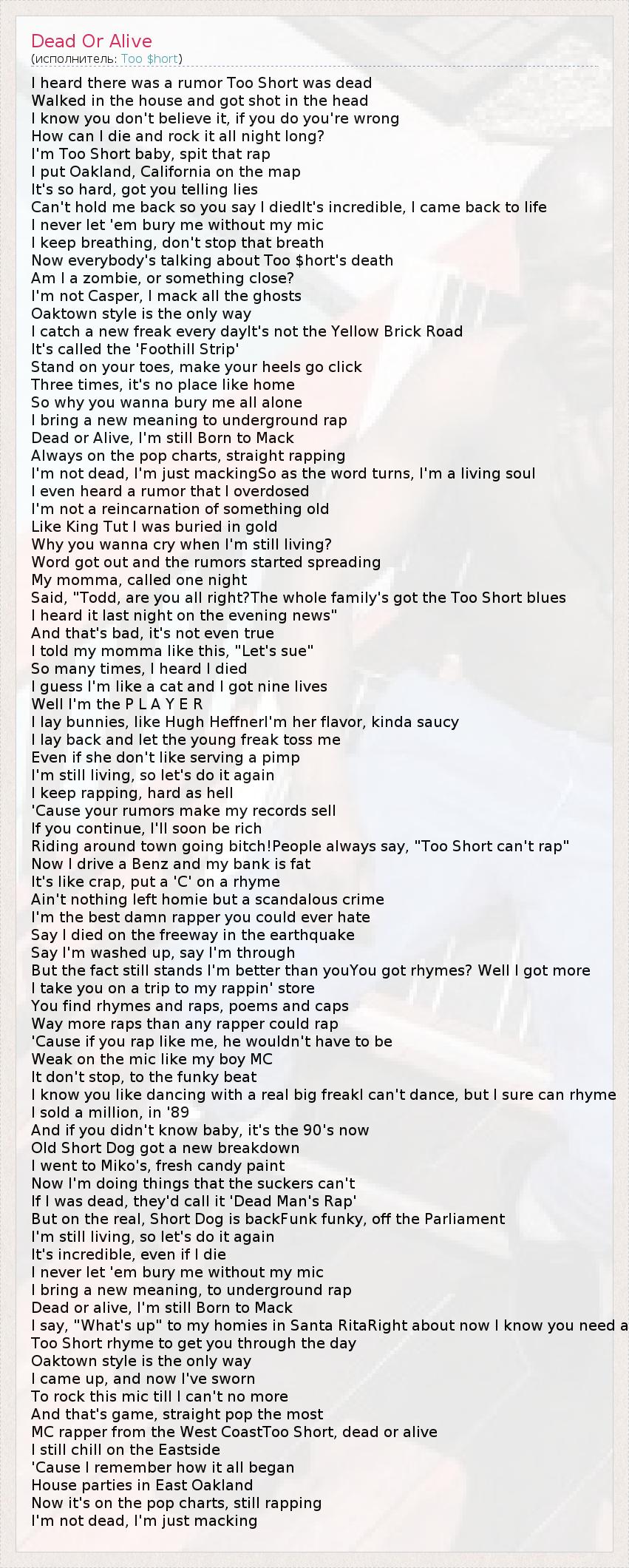 I heard there was a rumor Too Short was dead Walked in the house and got shot in the head I know you don't believe it, if you do you're wrong How can I die and rock it all night long? I'm Too Short baby, spit that rap I put Oakland, California on the map It's so hard, got you telling lies Can't hold me back so you say I diedIt's incredible, I came back to life I never let 'em bury me without my mic I keep breathing, don't stop that breath Now everybody's talking about Too $hort's death Am I a zombie, or something close? I'm not Casper, I mack all the ghosts Oaktown style is the only way I catch a new freak every dayIt's not the Yellow Brick Road It's called the 'Foothill Strip' Stand on your toes, make your heels go click Three times, it's no place like home So why you wanna bury me all alone I bring a new meaning to underground rap Dead or Alive, I'm still Born to Mack Always on the pop charts, straight rapping I'm not dead, I'm just mackingSo as the word turns, I'm a living soul I even heard a rumor that I overdosed I'm not a reincarnation of something old Like King Tut I was buried in gold Why you wanna cry when I'm still living? Word got out and the rumors started spreading My momma, called one night Said, "Todd, are you all right?The whole family's got the Too Short blues I heard it last night on the evening news" And that's bad, it's not even true I told my momma like this, "Let's sue" So many times, I heard I died I guess I'm like a cat and I got nine lives Well I'm the P L A Y E R I lay bunnies, like Hugh HeffnerI'm her flavor, kinda saucy I lay back and let the young freak toss me Even if she don't like serving a pimp I'm still living, so let's do it again I keep rapping, hard as hell 'Cause your rumors make my records sell If you continue, I'll soon be rich Riding around town going bitch!People always say, "Too Short can't rap" Now I drive a Benz and my bank is fat It's like crap, put a 'C' on a rhyme Ain't nothing left homie but a scandalous crime I'm the best damn rapper you could ever hate Say I died on the freeway in the earthquake Say I'm washed up, say I'm through But the fact still stands I'm better than youYou got rhymes? Well I got more I take you on a trip to my rappin' store You find rhymes and raps, poems and caps Way more raps than any rapper could rap 'Cause if you rap like me, he wouldn't have to be Weak on the mic like my boy MC It don't stop, to the funky beat I know you like dancing with a real big freakI can't dance, but I sure can rhyme I sold a million, in '89 And if you didn't know baby, it's the 90's now Old Short Dog got a new breakdown I went to Miko's, fresh candy paint Now I'm doing things that the suckers can't If I was dead, they'd call it 'Dead Man's Rap' But on the real, Short Dog is backFunk funky, off the Parliament I'm still living, so let's do it again It's incredible, even if I die I never let 'em bury me without my mic I bring a new meaning, to underground rap Dead or alive, I'm still Born to Mack I say, "What's up" to my homies in Santa RitaRight about now I know you need a Too Short rhyme to get you through the day Oaktown style is the only way I came up, and now I've sworn To rock this mic till I can't no more And that's game, straight pop the most MC rapper from the West CoastToo Short, dead or alive I still chill on the Eastside 'Cause I remember how it all began House parties in East Oakland Now it's on the pop charts, still rapping I'm not dead, I'm just macking