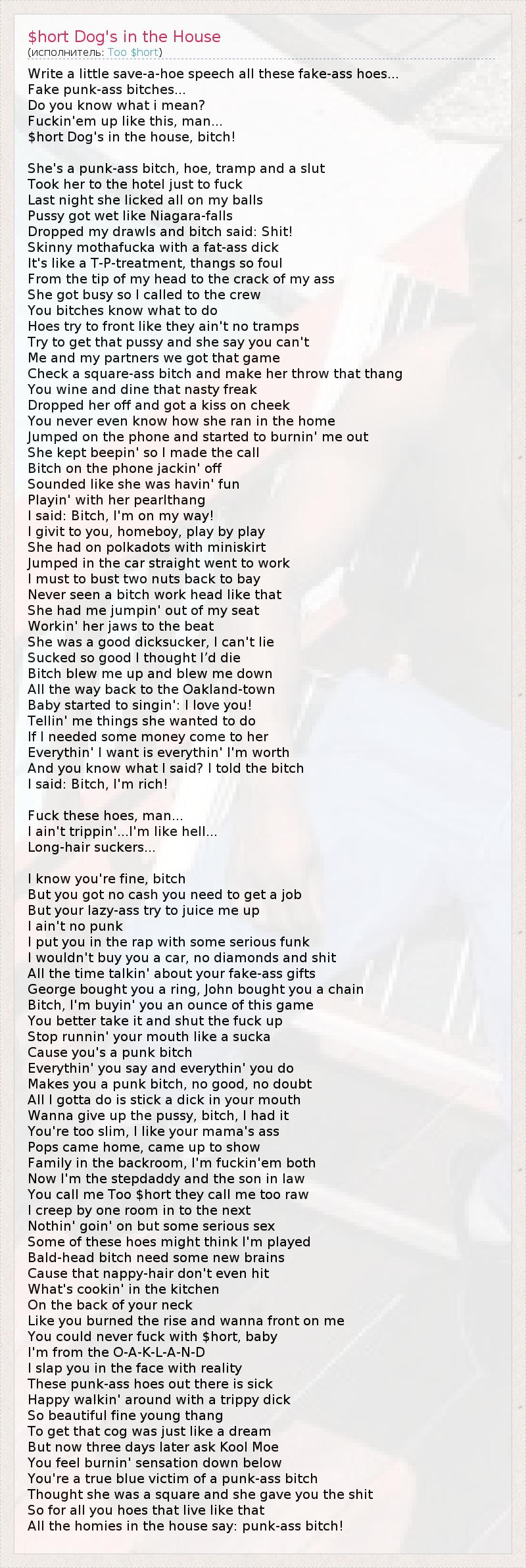Write a little save-a-hoe speech all these fake-ass hoes... Fake punk-ass bitches... Do you know what i mean? Fuckin'em up like this, man... $hort Dog's in the house, bitch! She's a punk-ass bitch, hoe, tramp and a slut Took her to the hotel just to fuck Last night she licked all on my balls Pussy got wet like Niagara-falls Dropped my drawls and bitch said: Shit! Skinny mothafucka with a fat-ass dick It's like a T-P-treatment, thangs so foul From the tip of my head to the crack of my ass She got busy so I called to the crew You bitches know what to do Hoes try to front like they ain't no tramps Try to get that pussy and she say you can't Me and my partners we got that game Check a square-ass bitch and make her throw that thang You wine and dine that nasty freak Dropped her off and got a kiss on cheek You never even know how she ran in the home Jumped on the phone and started to burnin' me out She kept beepin' so I made the call Bitch on the phone jackin' off Sounded like she was havin' fun Playin' with her pearlthang I said: Bitch, I'm on my way! I givit to you, homeboy, play by play She had on polkadots with miniskirt Jumped in the car straight went to work I must to bust two nuts back to bay Never seen a bitch work head like that She had me jumpin' out of my seat Workin' her jaws to the beat She was a good dicksucker, I can't lie Sucked so good I thought I’d die Bitch blew me up and blew me down All the way back to the Oakland-town Baby started to singin': I love you! Tellin' me things she wanted to do If I needed some money come to her Everythin' I want is everythin' I'm worth And you know what I said? I told the bitch I said: Bitch, I'm rich! Fuck these hoes, man... I ain't trippin'...I'm like hell... Long-hair suckers... I know you're fine, bitch But you got no cash you need to get a job But your lazy-ass try to juice me up I ain't no punk I put you in the rap with some serious funk I wouldn't buy you a car, no diamonds and shit All the time talkin' about your fake-ass gifts George bought you a ring, John bought you a chain Bitch, I'm buyin' you an ounce of this game You better take it and shut the fuck up Stop runnin' your mouth like a sucka Cause you's a punk bitch Everythin' you say and everythin' you do Makes you a punk bitch, no good, no doubt All I gotta do is stick a dick in your mouth Wanna give up the pussy, bitch, I had it You're too slim, I like your mama's ass Pops came home, came up to show Family in the backroom, I'm fuckin'em both Now I'm the stepdaddy and the son in law You call me Too $hort they call me too raw I creep by one room in to the next Nothin' goin' on but some serious sex Some of these hoes might think I'm played Bald-head bitch need some new brains Cause that nappy-hair don't even hit What's cookin' in the kitchen On the back of your neck Like you burned the rise and wanna front on me You could never fuck with $hort, baby I'm from the O-A-K-L-A-N-D I slap you in the face with reality These punk-ass hoes out there is sick Happy walkin' around with a trippy dick So beautiful fine young thang To get that cog was just like a dream But now three days later ask Kool Moe You feel burnin' sensation down below You're a true blue victim of a punk-ass bitch Thought she was a square and she gave you the shit So for all you hoes that live like that All the homies in the house say: punk-ass bitch!