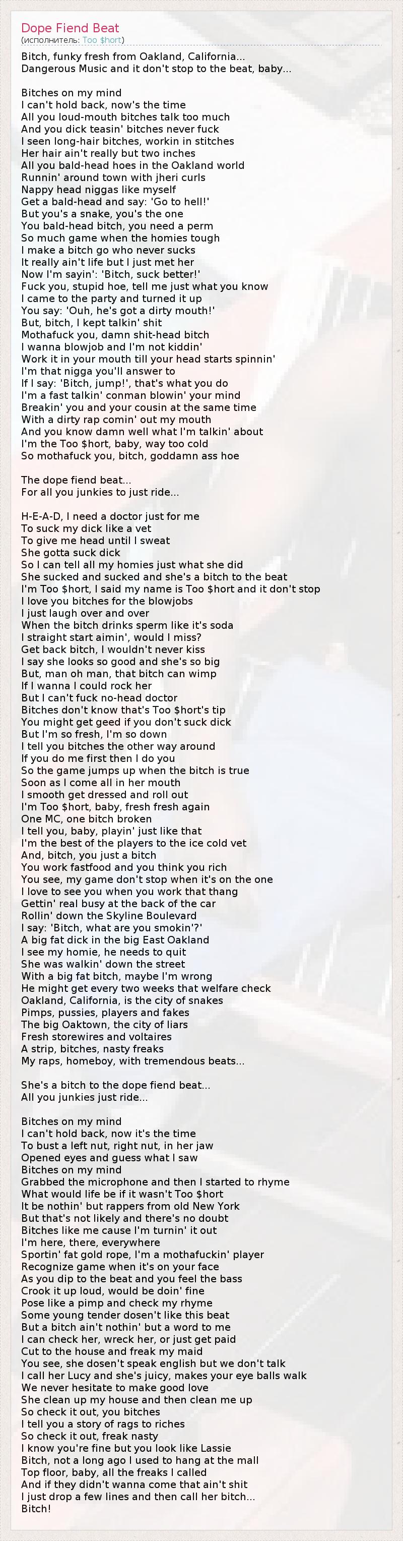Bitch, funky fresh from Oakland, California... Dangerous Music and it don't stop to the beat, baby... Bitches on my mind I can't hold back, now's the time All you loud-mouth bitches talk too much And you dick teasin' bitches never fuck I seen long-hair bitches, workin in stitches Her hair ain't really but two inches All you bald-head hoes in the Oakland world Runnin' around town with jheri curls Nappy head niggas like myself Get a bald-head and say: 'Go to hell!' But you's a snake, you's the one You bald-head bitch, you need a perm So much game when the homies tough I make a bitch go who never sucks It really ain't life but I just met her Now I'm sayin': 'Bitch, suck better!' Fuck you, stupid hoe, tell me just what you know I came to the party and turned it up You say: 'Ouh, he's got a dirty mouth!' But, bitch, I kept talkin' shit Mothafuck you, damn shit-head bitch I wanna blowjob and I'm not kiddin' Work it in your mouth till your head starts spinnin' I'm that nigga you'll answer to If I say: 'Bitch, jump!', that's what you do I'm a fast talkin' conman blowin' your mind Breakin' you and your cousin at the same time With a dirty rap comin' out my mouth And you know damn well what I'm talkin' about I'm the Too $hort, baby, way too cold So mothafuck you, bitch, goddamn ass hoe The dope fiend beat... For all you junkies to just ride... H-E-A-D, I need a doctor just for me To suck my dick like a vet To give me head until I sweat She gotta suck dick So I can tell all my homies just what she did She sucked and sucked and she's a bitch to the beat I'm Too $hort, I said my name is Too $hort and it don't stop I love you bitches for the blowjobs I just laugh over and over When the bitch drinks sperm like it's soda I straight start aimin', would I miss? Get back bitch, I wouldn't never kiss I say she looks so good and she's so big But, man oh man, that bitch can wimp If I wanna I could rock her But I can't fuck no-head doctor Bitches don't know that's Too $hort's tip You might get geed if you don't suck dick But I'm so fresh, I'm so down I tell you bitches the other way around If you do me first then I do you So the game jumps up when the bitch is true Soon as I come all in her mouth I smooth get dressed and roll out I'm Too $hort, baby, fresh fresh again One MC, one bitch broken I tell you, baby, playin' just like that I'm the best of the players to the ice cold vet And, bitch, you just a bitch You work fastfood and you think you rich You see, my game don't stop when it's on the one I love to see you when you work that thang Gettin' real busy at the back of the car Rollin' down the Skyline Boulevard I say: 'Bitch, what are you smokin'?' A big fat dick in the big East Oakland I see my homie, he needs to quit She was walkin' down the street With a big fat bitch, maybe I'm wrong He might get every two weeks that welfare check Oakland, California, is the city of snakes Pimps, pussies, players and fakes The big Oaktown, the city of liars Fresh storewires and voltaires A strip, bitches, nasty freaks My raps, homeboy, with tremendous beats... She's a bitch to the dope fiend beat... All you junkies just ride... Bitches on my mind I can't hold back, now it's the time To bust a left nut, right nut, in her jaw Opened eyes and guess what I saw Bitches on my mind Grabbed the microphone and then I started to rhyme What would life be if it wasn't Too $hort It be nothin' but rappers from old New York But that's not likely and there's no doubt Bitches like me cause I'm turnin' it out I'm here, there, everywhere Sportin' fat gold rope, I'm a mothafuckin' player Recognize game when it's on your face As you dip to the beat and you feel the bass Crook it up loud, would be doin' fine Pose like a pimp and check my rhyme Some young tender dosen't like this beat But a bitch ain't nothin' but a word to me I can check her, wreck her, or just get paid Cut to the house and freak my maid You see, she dosen't speak english but we don't talk I call her Lucy and she's juicy, makes your eye balls walk We never hesitate to make good love She clean up my house and then clean me up So check it out, you bitches I tell you a story of rags to riches So check it out, freak nasty I know you're fine but you look like Lassie Bitch, not a long ago I used to hang at the mall Top floor, baby, all the freaks I called And if they didn't wanna come that ain't shit I just drop a few lines and then call her bitch... Bitch!