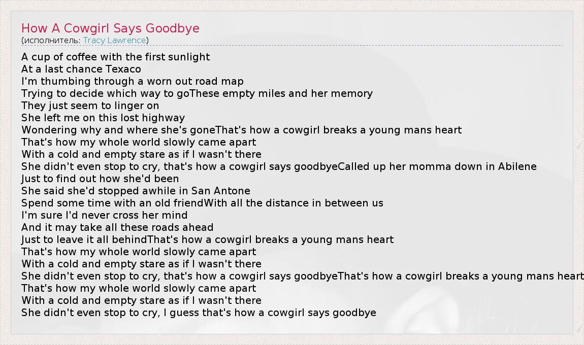 А как ты думаешь, о чем песня "How A Cowgirl Says Goodbye" ?