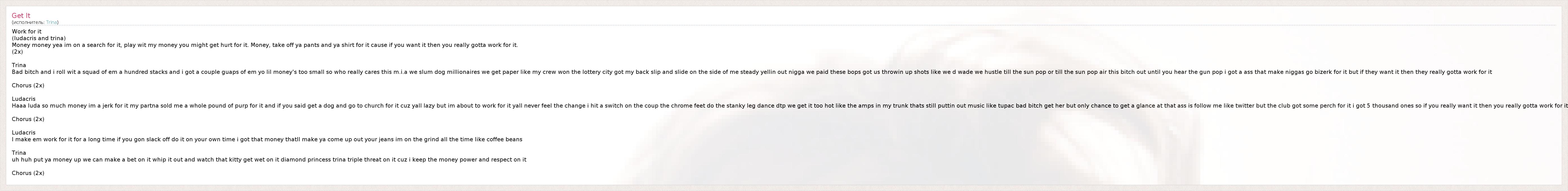 Haaa luda so much money im a jerk for it my partna sold me a whole pound of purp for it and if you said get a dog and go to church for it cuz yall lazy but im about to work for it yall never feel the change i hit a switch on the coup the chrome feet do the stanky leg dance dtp we get it too hot like the amps in my trunk thats still puttin out music like tupac bad bitch get her but only chance to get a glance at that ass is follow me like twitter but the club got some perch for it i got 5 thousand ones so if you really want it then you really gotta work for it
