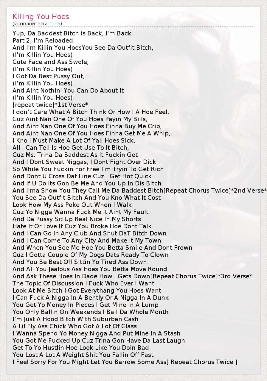 Yup, Da Baddest Bitch is Back, I'm Back Part 2, I'm Reloaded And I'm Killin You HoesYou See Da Outfit Bitch, (I'm Killin You Hoes) Cute Face and Ass Swole, (I'm Killin You Hoes) I Got Da Best Pussy Out, (I'm Killin You Hoes) And Aint Nothin' You Can Do About It (I'm Killin You Hoes) [repeat twice]*1st Verse* I don't Care What A Bitch Think Or How I A Hoe Feel, Cuz Aint Nan One Of You Hoes Payin My Bills, And Aint Nan One Of You Hoes Finna Buy Me Crib, And Aint Nan One Of You Hoes Finna Get Me A Whip, I Kno I Must Make A Lot Of Yall Hoes Sick, All I Can Tell Is Hoe Get Use To It Bitch, Cuz Ms. Trina Da Baddest As It Fuckin Get And I Dont Sweat Niggas, I Dont Fight Over Dick So While You Fuckin For Free I'm Tryin To Get Rich And Dont U Cross Dat Line Cuz I Get Hot Quick And If U Do Its Gon Be Me And You Up In Dis Bitch And I'ma Show You They Call Me Da Baddest Bitch[Repeat Chorus Twice]*2nd Verse* You See Da Outfit Bitch And You Kno What It Cost Look How My Ass Poke Out When I Walk Cuz Yo Nigga Wanna Fuck Me It Aint My Fault And Da Pussy Sit Up Real Nice In My Shorts Hate It Or Love It Cuz You Broke Hoe Dont Talk And I Can Go In Any Club And Shut DaT Bitch Down And I Can Come To Any City And Make It My Town And When You See Me Hoe You Betta Smile And Dont Frown Cuz I Gotta Couple Of My Dogs Dats Ready To Clown And You Be Best Off Sittin Yo Tired Ass Down And All You Jealous Ass Hoes You Betta Move Round And Ask These Hoes In Dade How I Gets Down[Repeat Chorus Twice]*3rd Verse* The Topic Of Discussion I Fuck Who Ever I Want Look At Me Bitch I Got Everythang You Hoes Want I Can Fuck A Nigga In A Bently Or A Nigga In A Dunk You Get Yo Money In Pieces I Get Mine In A Lump You Only Ballin On Weekends I Ball Da Whole Month I'm Just A Hood Bitch With Suburban Cash A Lil Fly Ass Chick Who Got A Lot Of Class I Wanna Spend Yo Money Nigga And Put Mine In A Stash You Got Me Fucked Up Cuz Trina Gon Have Da Last Laugh Get To Yo Hustlin Hoe Look Like You Doin Bad You Lost A Lot A Weight Shit You Fallin Off Fast I Feel Sorry For You Might Let You Barrow Some Ass[ Repeat Chorus Twice ]