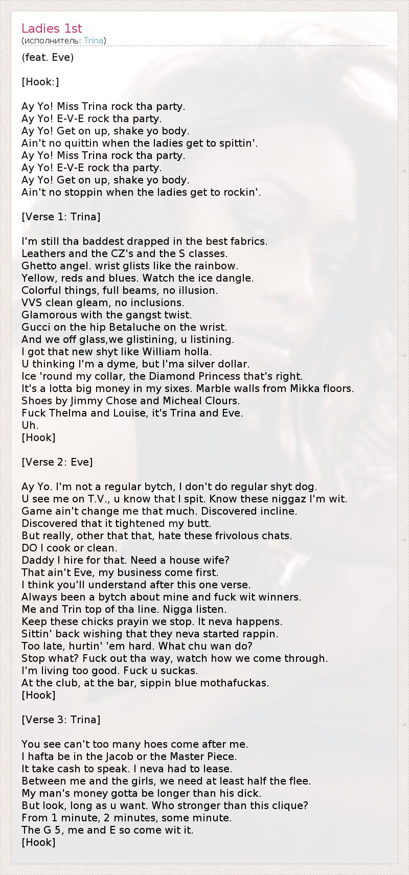 Это интересно:Катрина Лаверн Тэйлор, более известная под сценическим именем Трина, родилась 3 декабря 1978 г. в Майами, Флорида, США.Трина дебютировала с песней «Nann Nigga» в 1998 г. на музыкальном лейбле 'Slip-N-Slide' при поддержке Трика Дэдди. Ее первые два альбома, «золотой» по продажам дебют «Da Baddest Bitch», 2000 г., и последующий «Diamond Princess», 2002 г., получивший подобный статус. Альбомы были выполнены в так называемом... продолжение