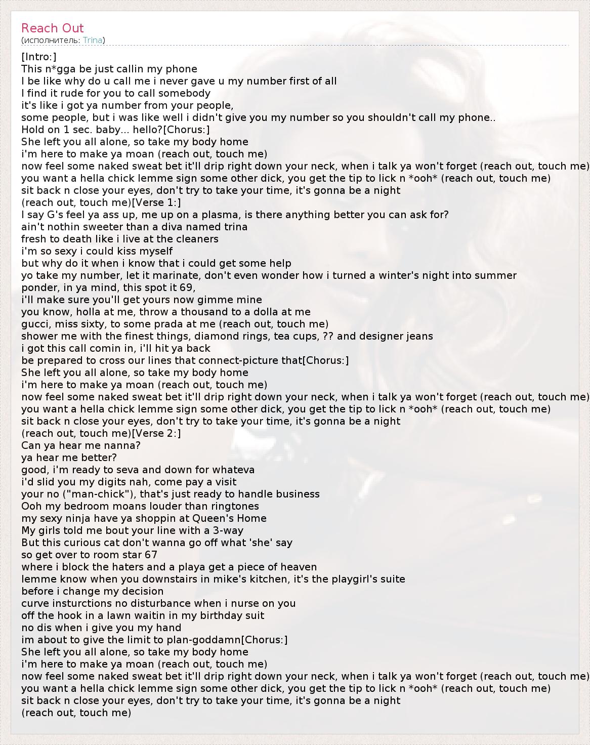 you want a hella chick lemme sign some other dick, you get the tip to lick n *ooh* (reach out, touch me)