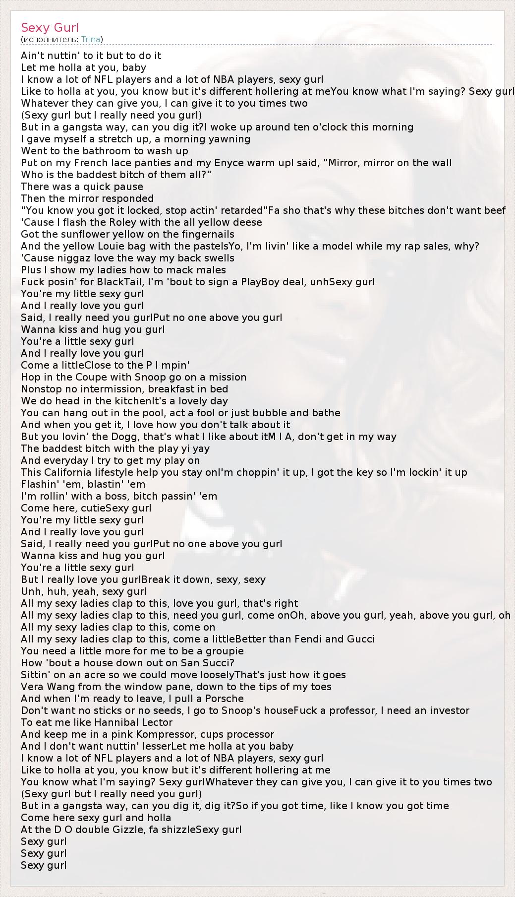 Это интересно:Катрина Лаверн Тэйлор, более известная под сценическим именем Трина, родилась 3 декабря 1978 г. в Майами, Флорида, США.Трина дебютировала с песней «Nann Nigga» в 1998 г. на музыкальном лейбле 'Slip-N-Slide' при поддержке Трика Дэдди. Ее первые два альбома, «золотой» по продажам дебют «Da Baddest Bitch», 2000 г., и последующий «Diamond Princess», 2002 г., получивший подобный статус. Альбомы были выполнены в так называемом... продолжение