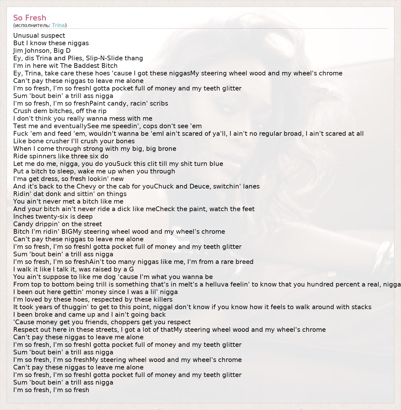Ey, Trina, take care these hoes 'cause I got these niggasMy steering wheel wood and my wheel's chrome