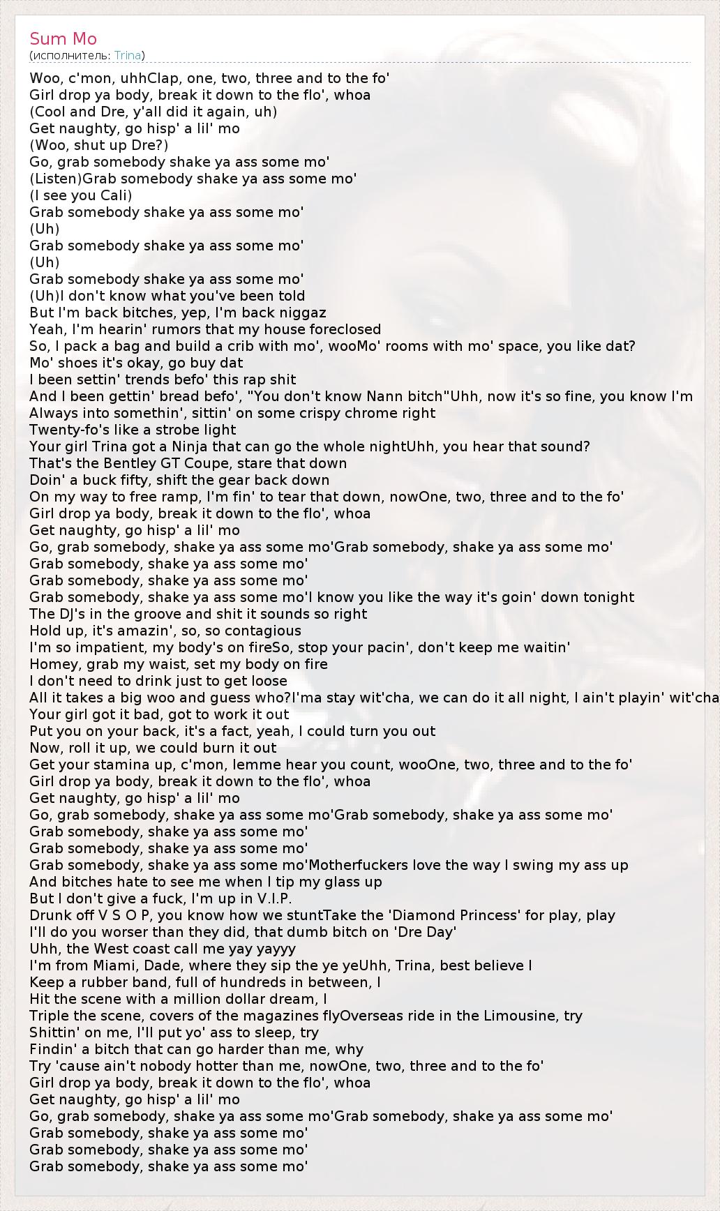 Это интересно:Катрина Лаверн Тэйлор, более известная под сценическим именем Трина, родилась 3 декабря 1978 г. в Майами, Флорида, США.Трина дебютировала с песней «Nann Nigga» в 1998 г. на музыкальном лейбле 'Slip-N-Slide' при поддержке Трика Дэдди. Ее первые два альбома, «золотой» по продажам дебют «Da Baddest Bitch», 2000 г., и последующий «Diamond Princess», 2002 г., получивший подобный статус. Альбомы были выполнены в так называемом... продолжение