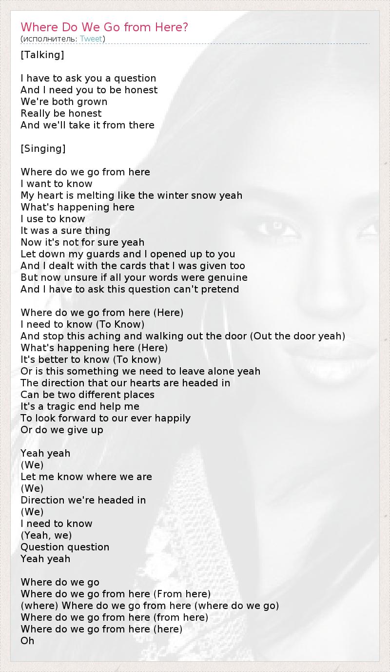 ГлавнаяИсполнителиTweetWhere Do We Go from Here?