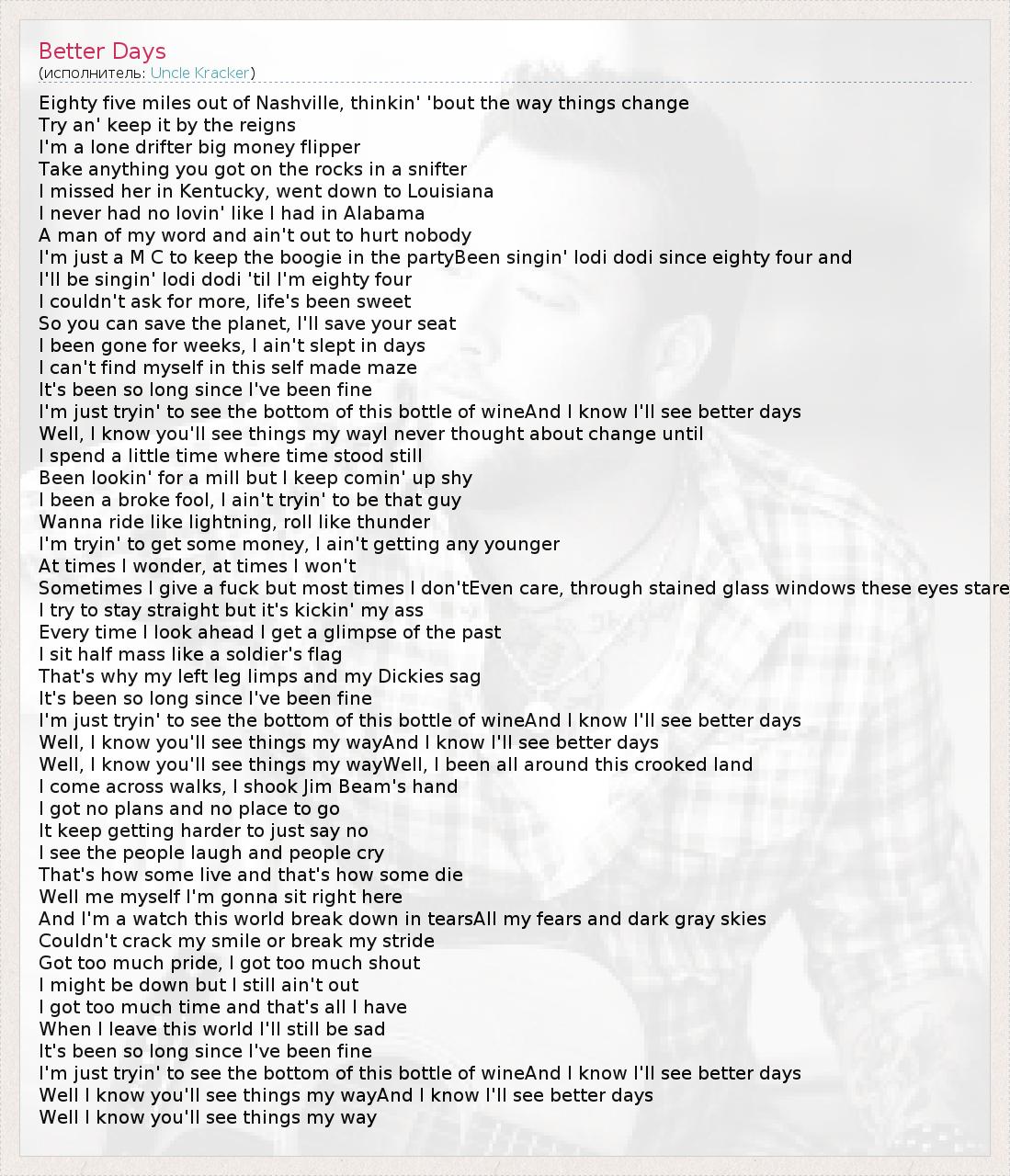 Это интересно:Uncle Kracker (настоящее имя Matthew Shafer) - американский рок-певец. Родился 9 ноября 1974 года в Мичигане. В 1987 году встретил Кид Рока, который попросил его стать ди-джеем. В середине 1990 годов Kracker занимался ди-джействованием в Детройте, в клубе The Pretty Woman. В 1999 году вышел дебютный альбом "Double Wide". Uncle Kracker участвовал в записи альбома Кид Рока "Cocky" в 2001 году. 16 ноября 2006 года началась работа над... продолжение