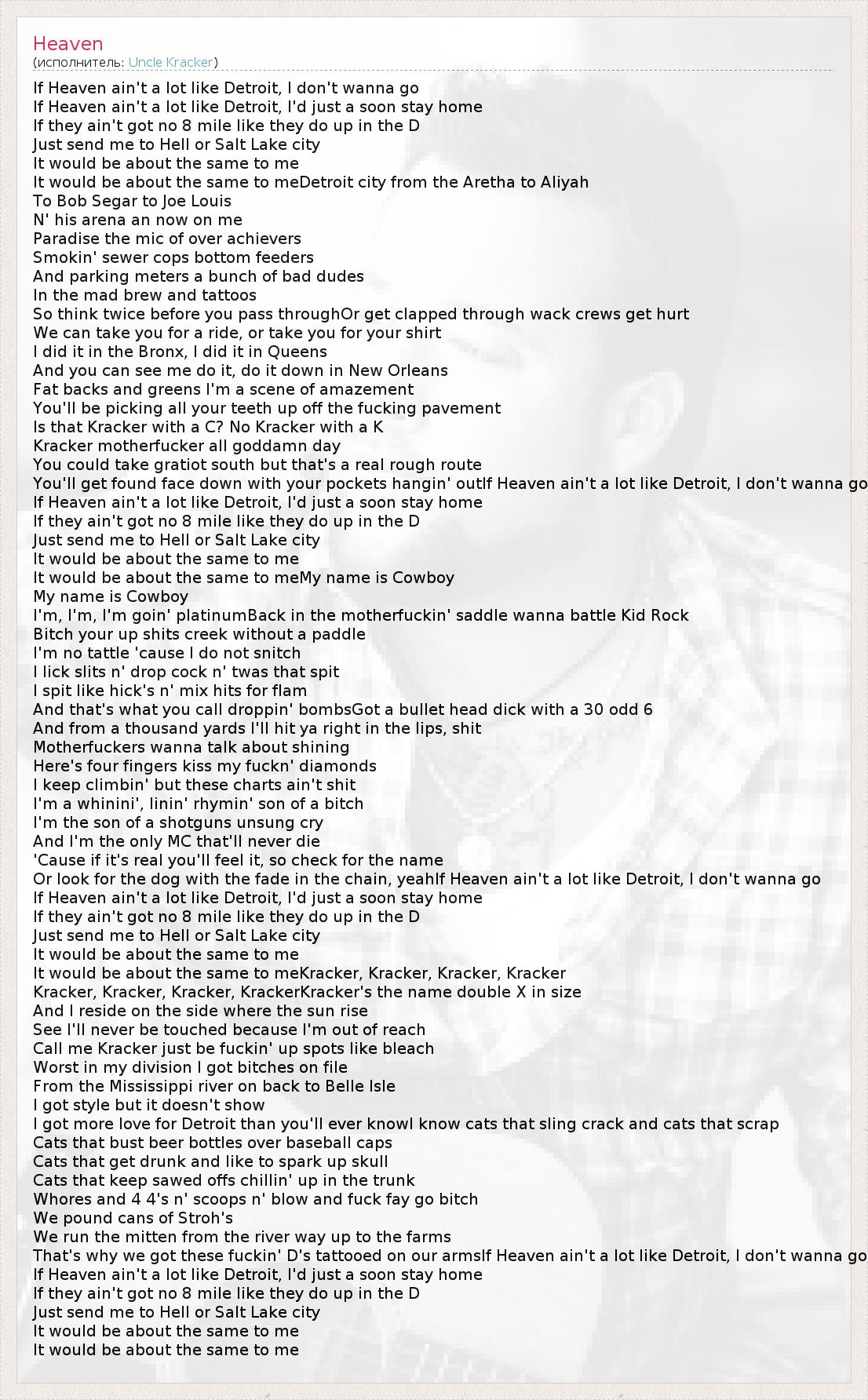 You'll get found face down with your pockets hangin' outIf Heaven ain't a lot like Detroit, I don't wanna go