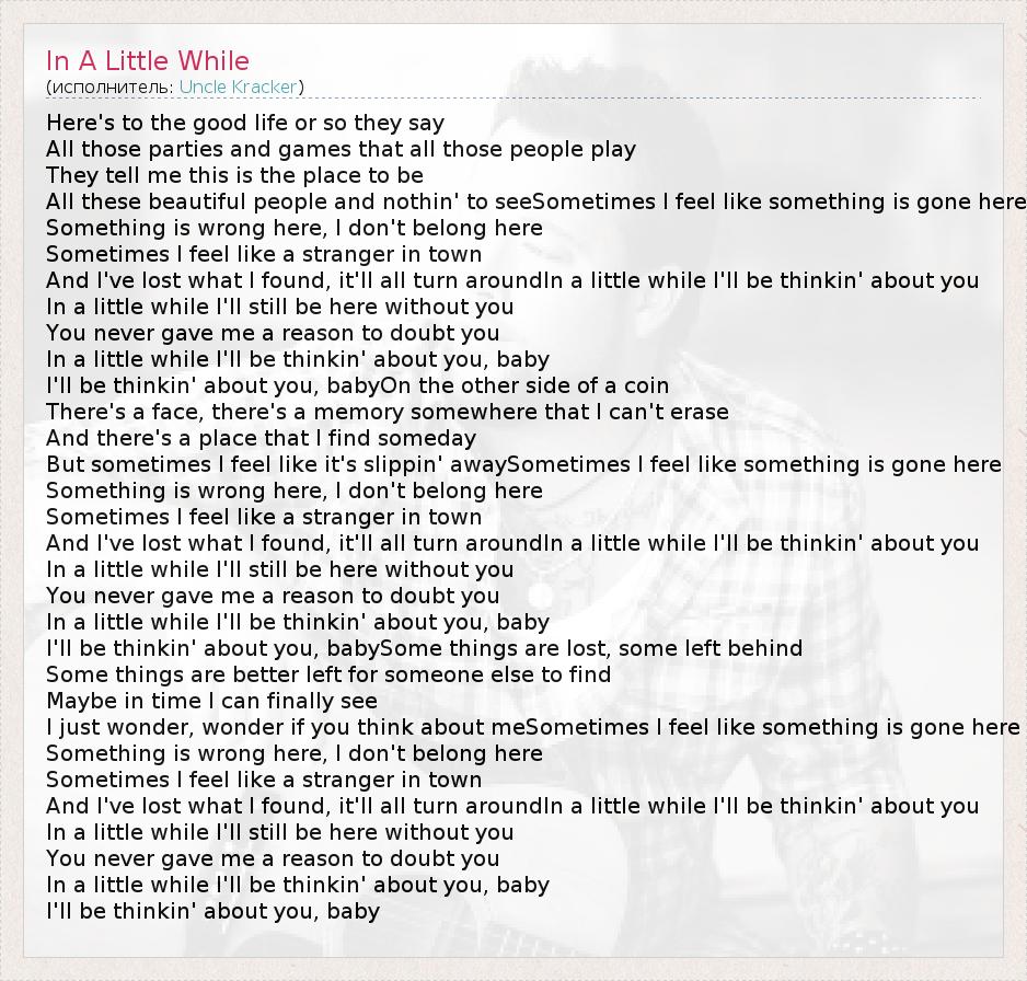 Here's to the good life or so they say All those parties and games that all those people play They tell me this is the place to be All these beautiful people and nothin' to seeSometimes I feel like something is gone here Something is wrong here, I don't belong here Sometimes I feel like a stranger in town And I've lost what I found, it'll all turn aroundIn a little while I'll be thinkin' about you In a little while I'll still be here without you You never gave me a reason to doubt you In a little while I'll be thinkin' about you, baby I'll be thinkin' about you, babyOn the other side of a coin There's a face, there's a memory somewhere that I can't erase And there's a place that I find someday But sometimes I feel like it's slippin' awaySometimes I feel like something is gone here Something is wrong here, I don't belong here Sometimes I feel like a stranger in town And I've lost what I found, it'll all turn aroundIn a little while I'll be thinkin' about you In a little while I'll still be here without you You never gave me a reason to doubt you In a little while I'll be thinkin' about you, baby I'll be thinkin' about you, babySome things are lost, some left behind Some things are better left for someone else to find Maybe in time I can finally see I just wonder, wonder if you think about meSometimes I feel like something is gone here Something is wrong here, I don't belong here Sometimes I feel like a stranger in town And I've lost what I found, it'll all turn aroundIn a little while I'll be thinkin' about you In a little while I'll still be here without you You never gave me a reason to doubt you In a little while I'll be thinkin' about you, baby I'll be thinkin' about you, baby
