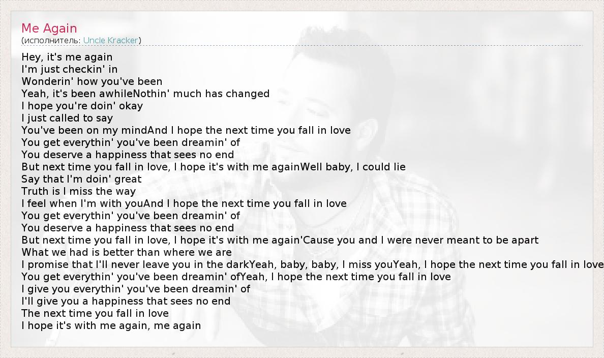 Это интересно:Uncle Kracker (настоящее имя Matthew Shafer) - американский рок-певец. Родился 9 ноября 1974 года в Мичигане. В 1987 году встретил Кид Рока, который попросил его стать ди-джеем. В середине 1990 годов Kracker занимался ди-джействованием в Детройте, в клубе The Pretty Woman. В 1999 году вышел дебютный альбом "Double Wide". Uncle Kracker участвовал в записи альбома Кид Рока "Cocky" в 2001 году. 16 ноября 2006 года началась работа над... продолжение