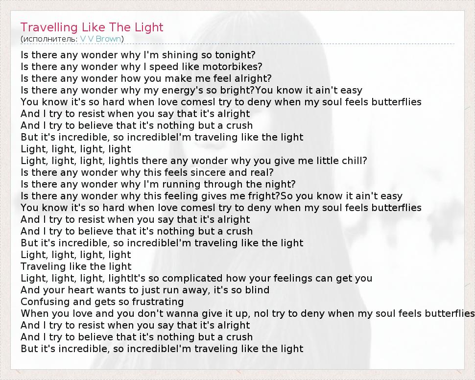 Is there any wonder why I'm shining so tonight? Is there any wonder why I speed like motorbikes? Is there any wonder how you make me feel alright? Is there any wonder why my energy's so bright?You know it ain't easy You know it's so hard when love comesI try to deny when my soul feels butterflies And I try to resist when you say that it's alright And I try to believe that it's nothing but a crush But it's incredible, so incredibleI'm traveling like the light Light, light, light, light Light, light, light, lightIs there any wonder why you give me little chill? Is there any wonder why this feels sincere and real? Is there any wonder why I'm running through the night? Is there any wonder why this feeling gives me fright?So you know it ain't easy You know it's so hard when love comesI try to deny when my soul feels butterflies And I try to resist when you say that it's alright And I try to believe that it's nothing but a crush But it's incredible, so incredibleI'm traveling like the light Light, light, light, light Traveling like the light Light, light, light, lightIt's so complicated how your feelings can get you And your heart wants to just run away, it's so blind Confusing and gets so frustrating When you love and you don't wanna give it up, noI try to deny when my soul feels butterflies And I try to resist when you say that it's alright And I try to believe that it's nothing but a crush But it's incredible, so incredibleI'm traveling like the light