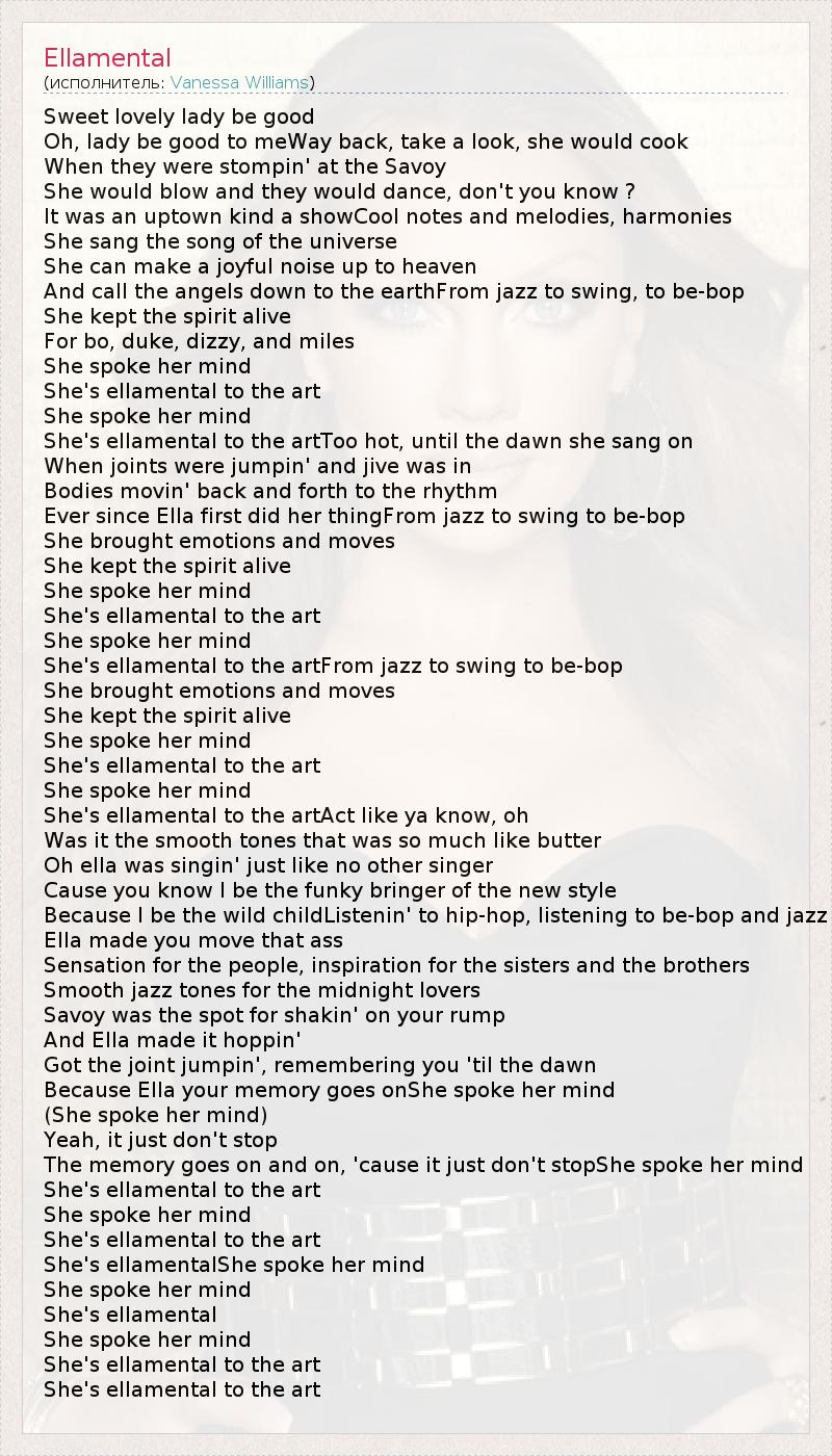 Sweet lovely lady be good Oh, lady be good to meWay back, take a look, she would cook When they were stompin' at the Savoy She would blow and they would dance, don't you know ? It was an uptown kind a showCool notes and melodies, harmonies She sang the song of the universe She can make a joyful noise up to heaven And call the angels down to the earthFrom jazz to swing, to be-bop She kept the spirit alive For bo, duke, dizzy, and miles She spoke her mind She's ellamental to the art She spoke her mind She's ellamental to the artToo hot, until the dawn she sang on When joints were jumpin' and jive was in Bodies movin' back and forth to the rhythm Ever since Ella first did her thingFrom jazz to swing to be-bop She brought emotions and moves She kept the spirit alive She spoke her mind She's ellamental to the art She spoke her mind She's ellamental to the artFrom jazz to swing to be-bop She brought emotions and moves She kept the spirit alive She spoke her mind She's ellamental to the art She spoke her mind She's ellamental to the artAct like ya know, oh Was it the smooth tones that was so much like butter Oh ella was singin' just like no other singer Cause you know I be the funky bringer of the new style Because I be the wild childListenin' to hip-hop, listening to be-bop and jazz Ella made you move that ass Sensation for the people, inspiration for the sisters and the brothers Smooth jazz tones for the midnight lovers Savoy was the spot for shakin' on your rump And Ella made it hoppin' Got the joint jumpin', remembering you 'til the dawn Because Ella your memory goes onShe spoke her mind (She spoke her mind) Yeah, it just don't stop The memory goes on and on, 'cause it just don't stopShe spoke her mind She's ellamental to the art She spoke her mind She's ellamental to the art She's ellamentalShe spoke her mind She spoke her mind She's ellamental She spoke her mind She's ellamental to the art She's ellamental to the art