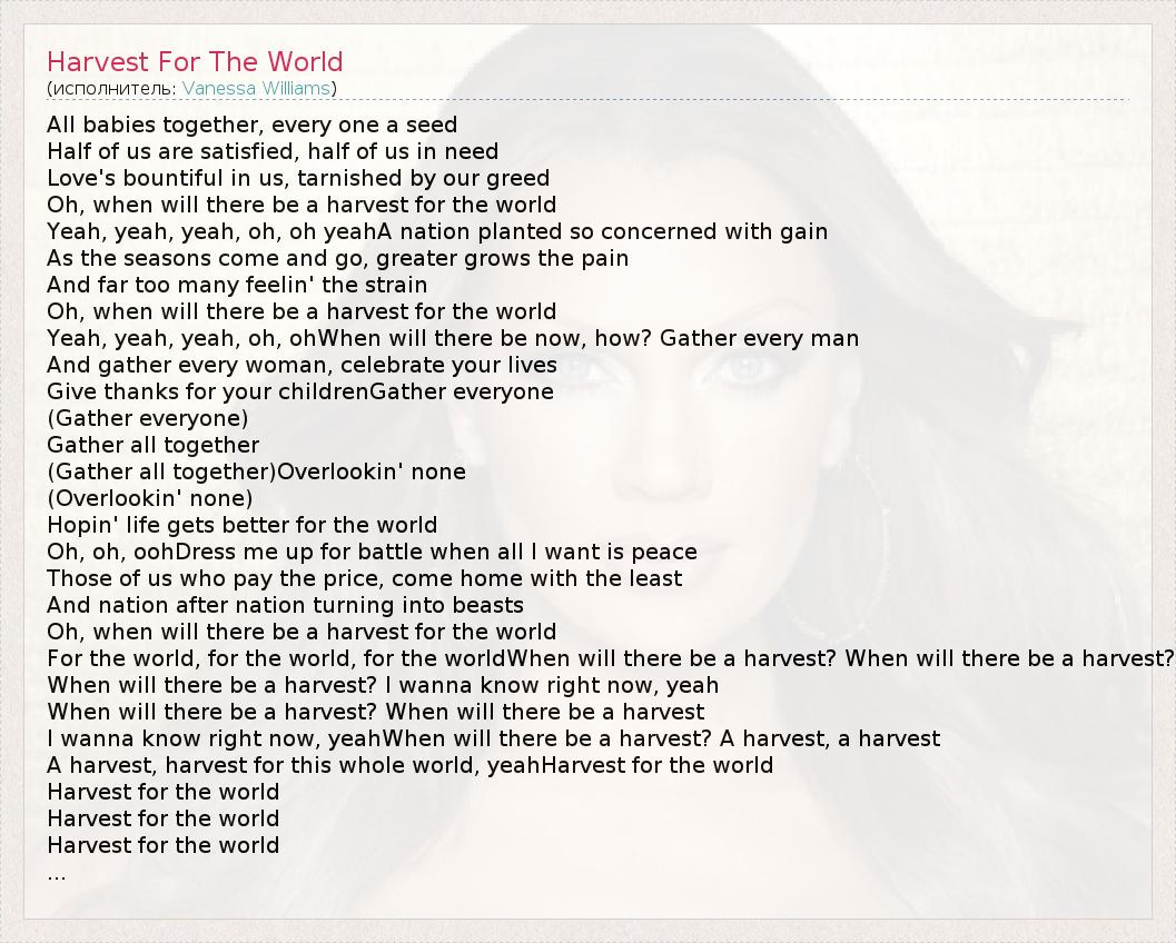 A harvest, harvest for this whole world, yeahHarvest for the world